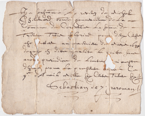 Isbrand de Crousaz devint unique seigneur de Corcelles en achetant en 1598 le reste de cette terre. En 1629, la petite-fille de celui-ci, Jeanne de Crousaz, qui avait reçu la seigneurie en héritage, épousa Noble Sébastien de Praroman (document signé ci-contre), et l'institua pour son héritier. Devenu veuf, il se remaria avec Louise Polier. Sans enfant, il testa en faveur de sa seconde femme qui convola encore, en 1683, avec Paul de Chandieu, seigneur de Villars. |